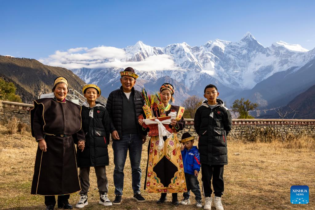 Tsering Toinzhub (3rd L) and Lhagba Zhoima (4th L) pose for a photo with their family in Suosong Village of Nyingchi, southwest China's Xizang Autonomous Region, Nov. 14, 2023.