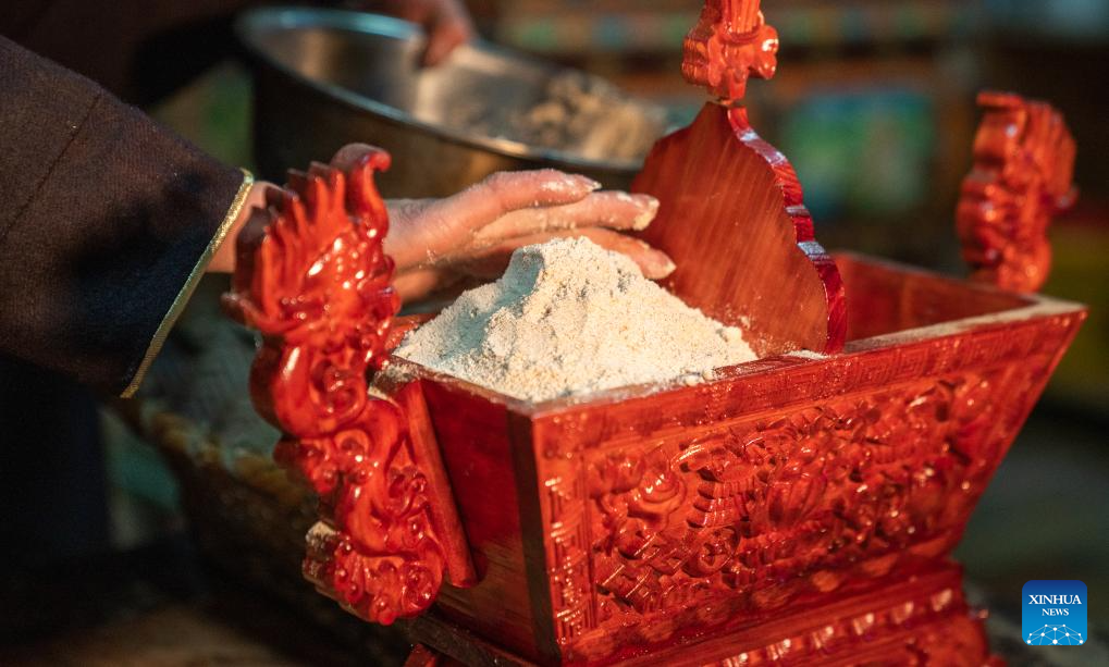 Lhagba Zhoima prepares chema, a two-tier rectangular wooden box containing roasted barley and fried wheat grain, in Suosong Village of Nyingchi, southwest China's Xizang Autonomous Region, Nov. 13, 2023.
