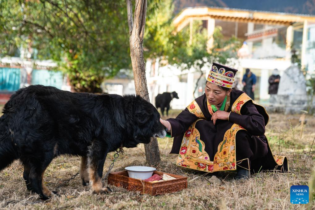 Lhagba Zhoima feeds a dog in Suosong Village of Nyingchi, southwest China's Xizang Autonomous Region, Nov. 14, 2023.