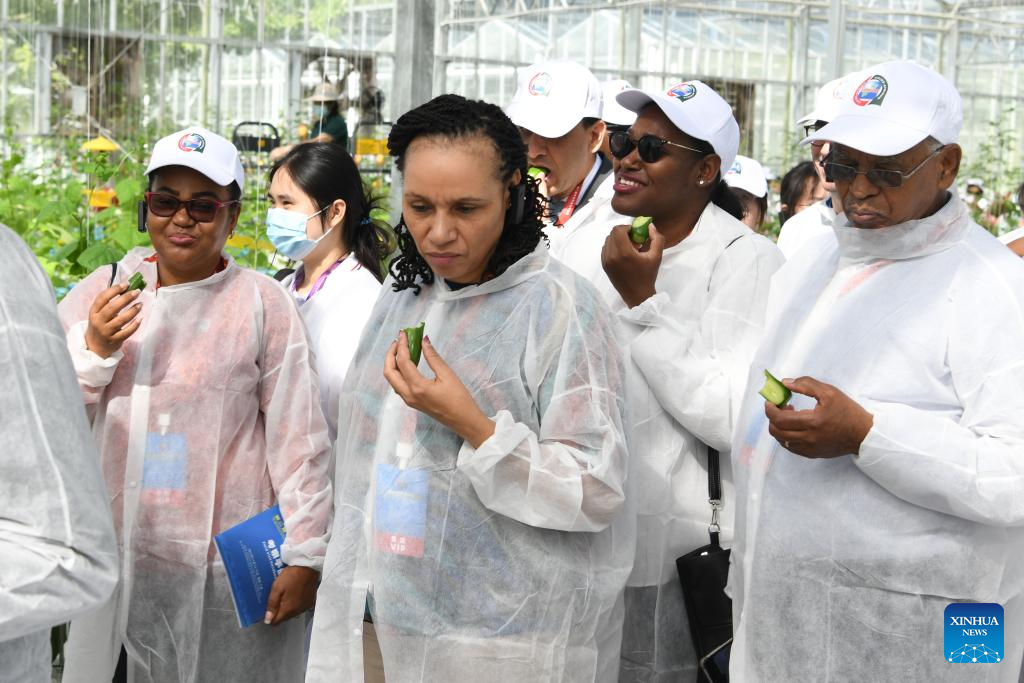 Participants of the 2nd Forum on China-Africa Cooperation in Agriculture try local produce while visiting an agricultural science and technology innovation center in Sanya, south China's Hainan Province, Nov. 14, 2023. The 2nd Forum on China-Africa Cooperation in Agriculture is held in Sanya from Monday to Wednesday. (Xinhua/Yang Guanyu)