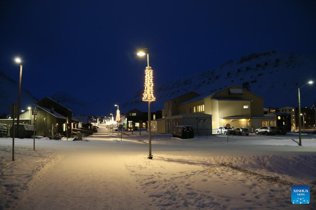 This photo taken on Nov. 14, 2023 shows a street in Longyearbyen, Svalbard, Norway. Longyearbyen is situated within the Svalbard archipelago at a latitude of approximately 78 degrees north, about 1,300 kilometers from the North Pole, where a polar night lasting up to four months takes place each year. (Xinhua/Zhang Yuliang)