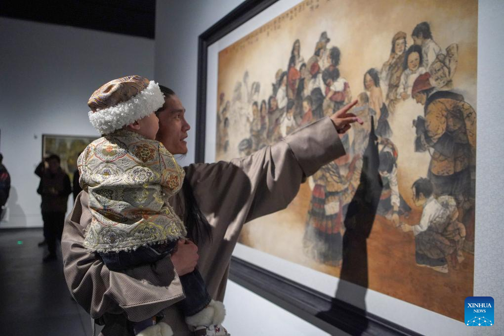 Visitors view exhibits in the Xizang Art Museum in Lhasa, capital of southwest China's Xizang Autonomous Region, Nov. 15, 2023. A new art museum opened on Wednesday in Lhasa, exhibiting nearly 300 works by famous artists.