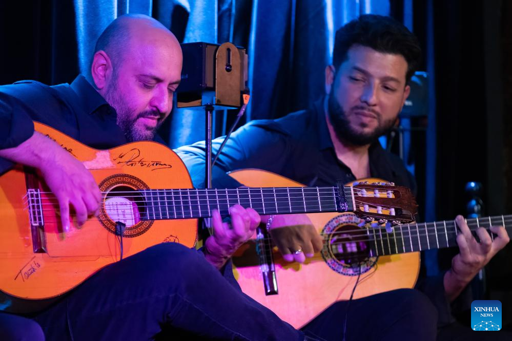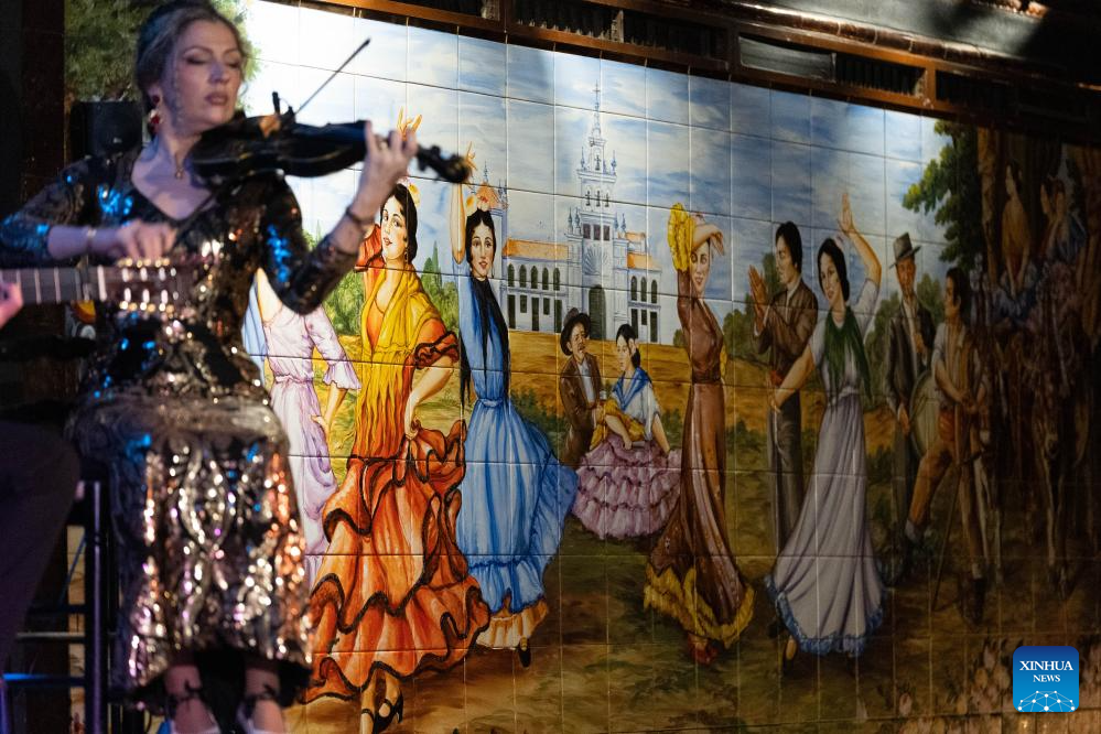 Actors perform at the Flamenco Tablao 1911 (formerly known as Villa-Rosa) in Madrid, Spain, on Nov. 16, 2023. Originated in 1911, the Flamenco Tablao 1911 is a tavern known for its Flamenco performance and decorations. King Alfonso XIII of Spain, famous writer Ernest Hemingway and some outstanding bullfighters in history were regulars here. (Xinhua/Meng Dingbo)