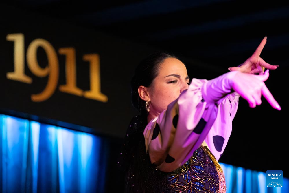 A dancer performs at the Flamenco Tablao 1911 (formerly known as Villa-Rosa) in Madrid, Spain, on Nov. 16, 2023. Originated in 1911, the Flamenco Tablao 1911 is a tavern known for its Flamenco performance and decorations. King Alfonso XIII of Spain, famous writer Ernest Hemingway and some outstanding bullfighters in history were regulars here. (Xinhua/Meng Dingbo)