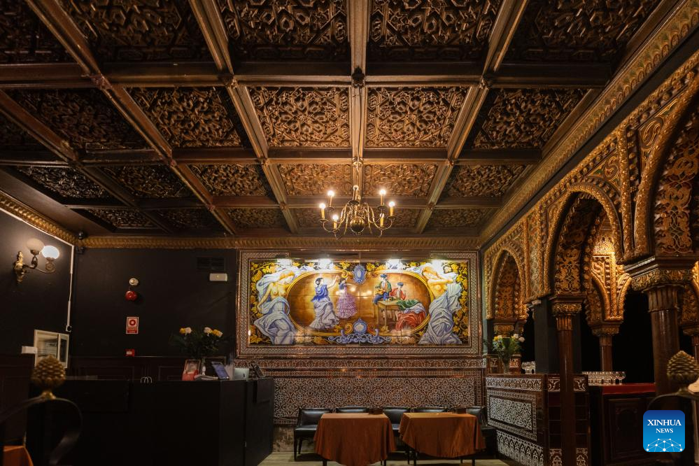 This photo taken on Nov. 16, 2023 shows an interior view of the Flamenco Tablao 1911 (formerly known as Villa-Rosa) in Madrid, Spain. Originated in 1911, the Flamenco Tablao 1911 is a tavern known for its Flamenco performance and decorations. King Alfonso XIII of Spain, famous writer Ernest Hemingway and some outstanding bullfighters in history were regulars here. (Xinhua/Meng Dingbo)