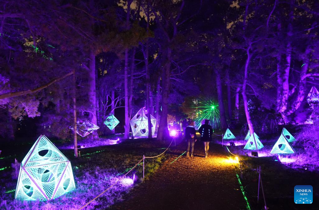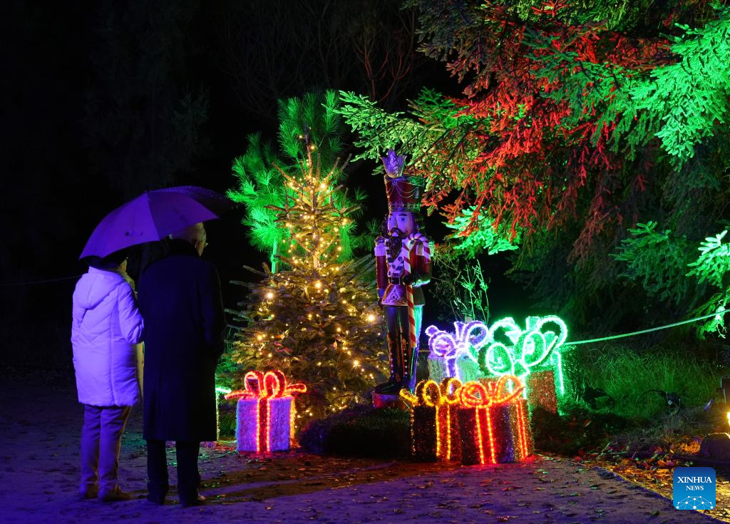 Visitors look at light decorations during the "Christmas Garden Berlin" light show at the Botanical Garden in Berlin, Germany, Nov. 17, 2023. The "Christmas Garden Berlin" kicked off on Friday here and will last until Jan. 14, 2024. (Photo by Stefan Zeitz/Xinhua)