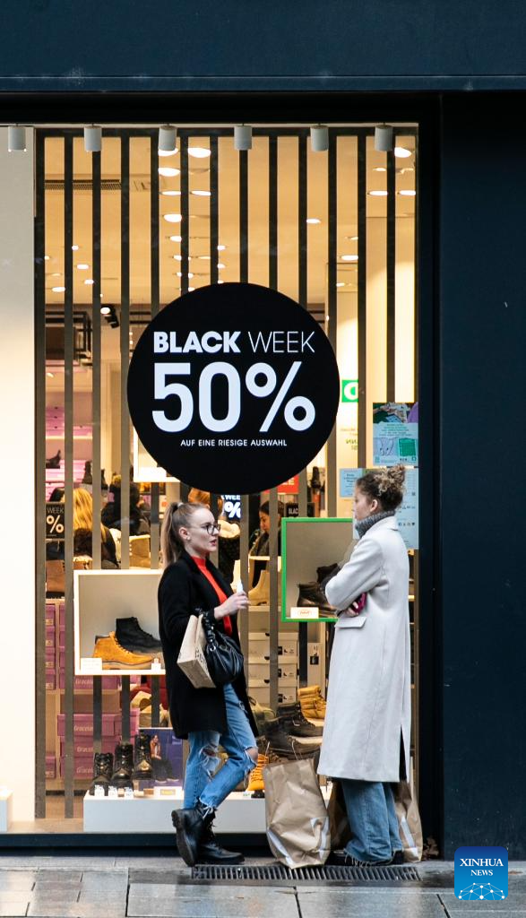 People walk past a shop during Black Friday sales in Frankfurt, Germany, Nov. 24, 2023. (Xinhua/Zhang Fan)