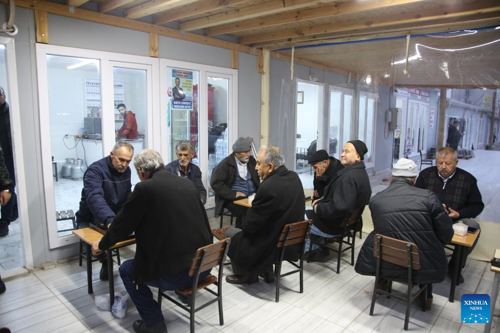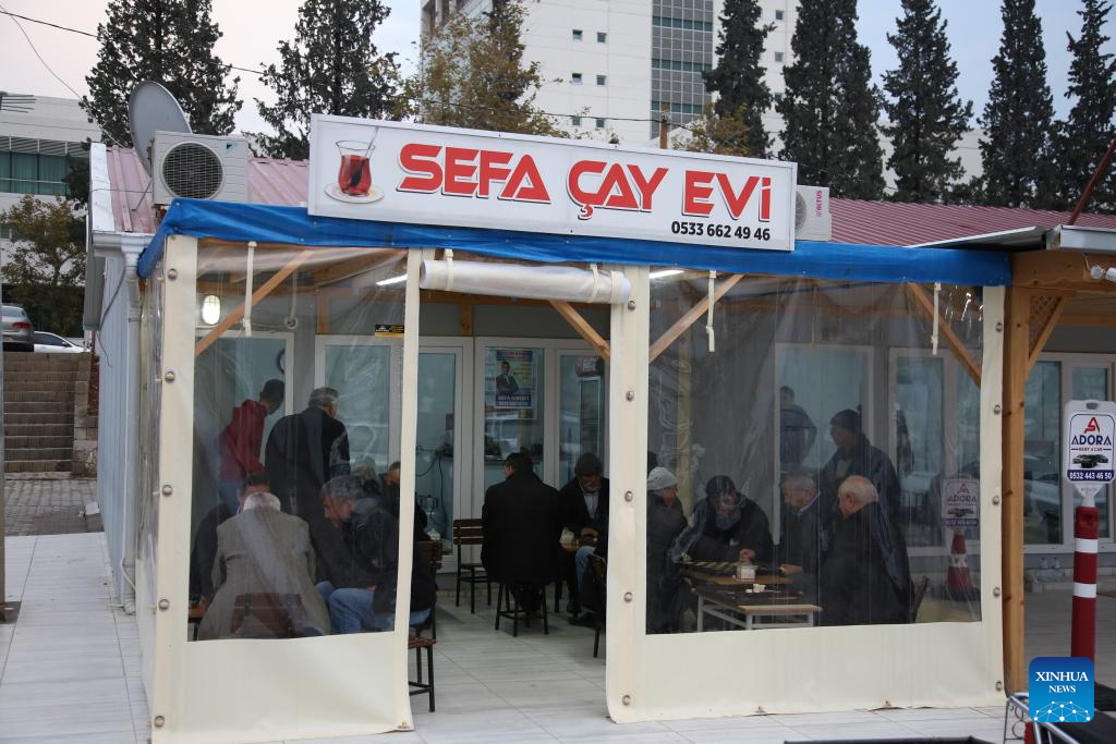 People enjoy their leisure time at a tea house transformed from a container in Kahramanmaras, Türkiye, Dec. 6, 2023. Kahramanmaras was the worst-hit province and the epicenter of the massive earthquakes in February this year. The reconstruction work has been carried out and residents here have got their lives back on track. (Xinhua/Li Zhenbei)