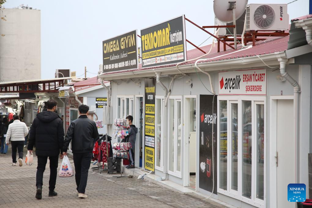 This photo taken on Dec. 6, 2023 shows shops transformed from containers in Kahramanmaras, Türkiye. Kahramanmaras was the worst-hit province and the epicenter of the massive earthquakes in February this year. The reconstruction work has been carried out and residents here have got their lives back on track. (Xinhua/Li Zhenbei)