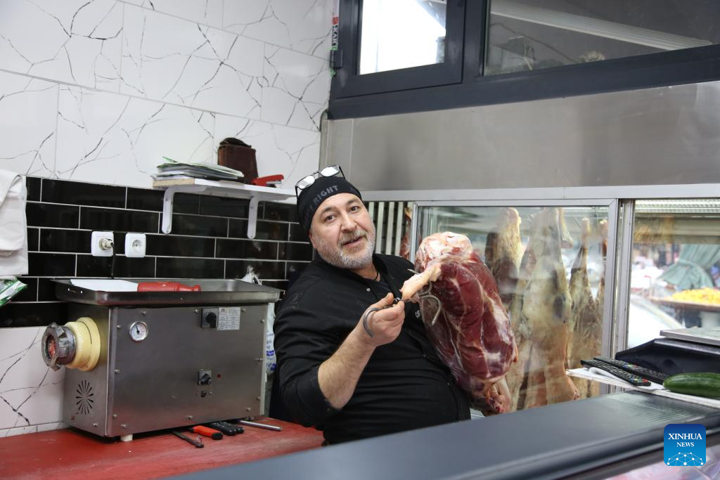 A man works at a butcher's shop in Kahramanmaras, Türkiye, Dec. 6, 2023. Kahramanmaras was the worst-hit province and the epicenter of the massive earthquakes in February this year. The reconstruction work has been carried out and residents here have got their lives back on track. (Xinhua/Li Zhenbei)