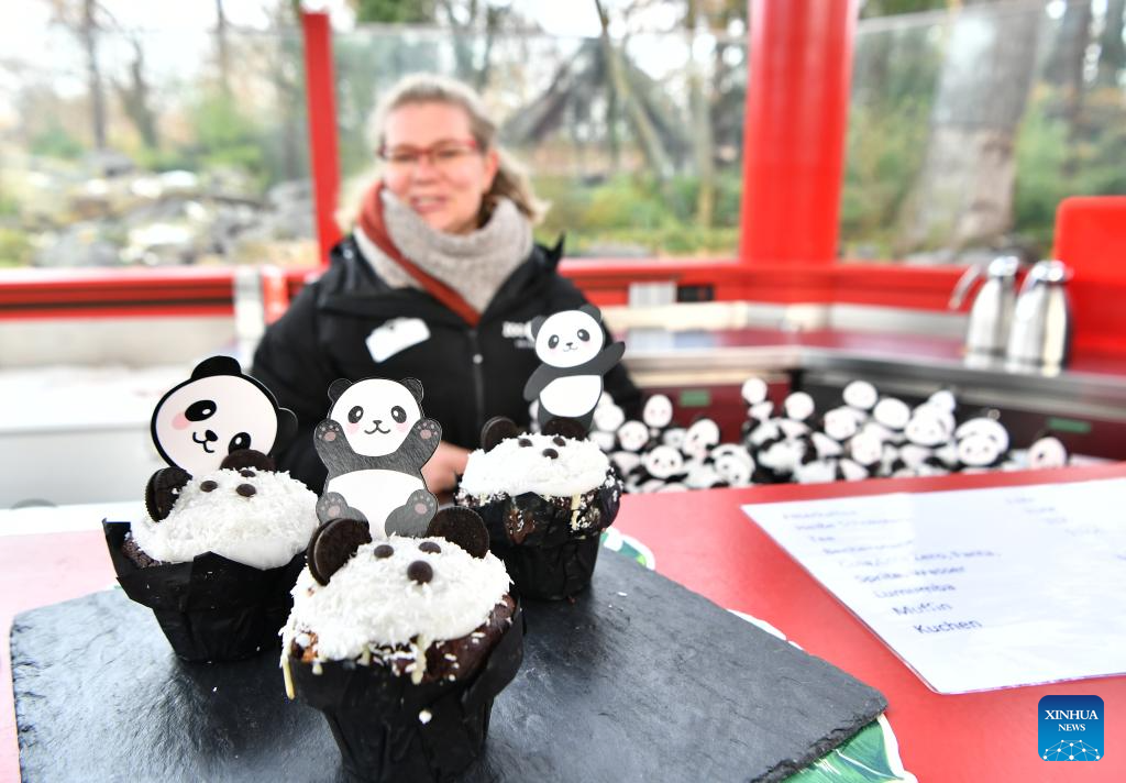 A staff member sells panda-shaped cakes at Berlin Zoo in Berlin, Germany, Dec. 8, 2023. Giant pandas "Meng Xiang" and "Meng Yuan", who are currently staying at Berlin Zoo, will return to China this December. To say goodbye to the giant pandas, the zoo held a farewell event for them on Friday. (Xinhua/Ren Pengfei)