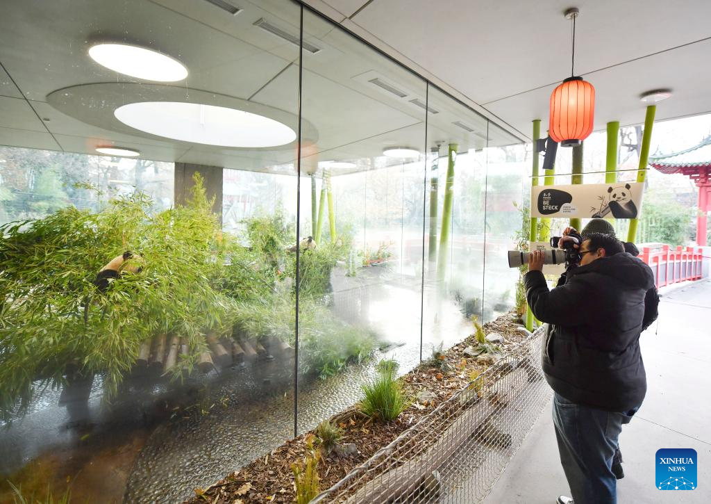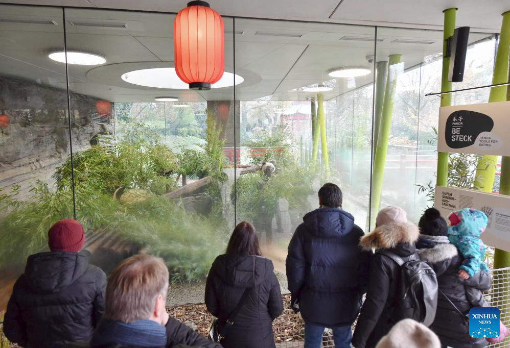 Visitors watch giant pandas at Berlin Zoo in Berlin, Germany, Dec. 8, 2023. Giant pandas "Meng Xiang" and "Meng Yuan", who are currently staying at Berlin Zoo, will return to China this December. To say goodbye to the giant pandas, the zoo held a farewell event for them on Friday. (Xinhua/Ren Pengfei)