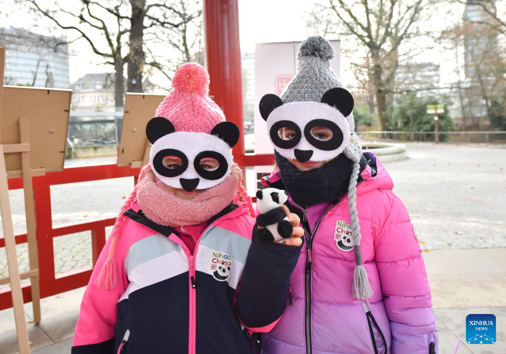 A child wearing panda mask shows a panda toy at Berlin Zoo in Berlin, Germany, Dec. 8, 2023. Giant pandas "Meng Xiang" and "Meng Yuan", who are currently staying at Berlin Zoo, will return to China this December. To say goodbye to the giant pandas, the zoo held a farewell event for them on Friday. (Xinhua/Ren Pengfei)