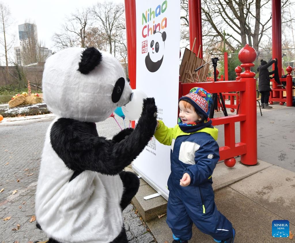 A child gives a high-five to a staff member in giant panda costume at Berlin Zoo in Berlin, Germany, Dec. 8, 2023. Giant pandas "Meng Xiang" and "Meng Yuan", who are currently staying at Berlin Zoo, will return to China this December. To say goodbye to the giant pandas, the zoo held a farewell event for them on Friday. (Xinhua/Ren Pengfei)
