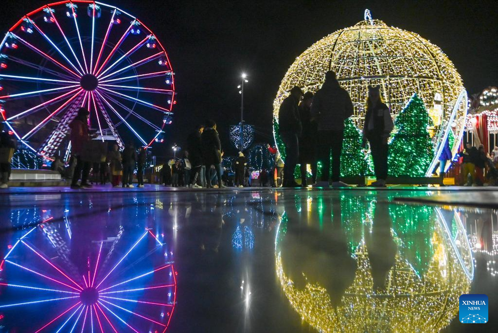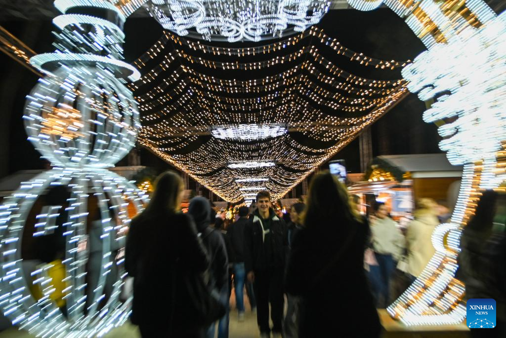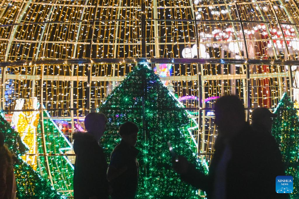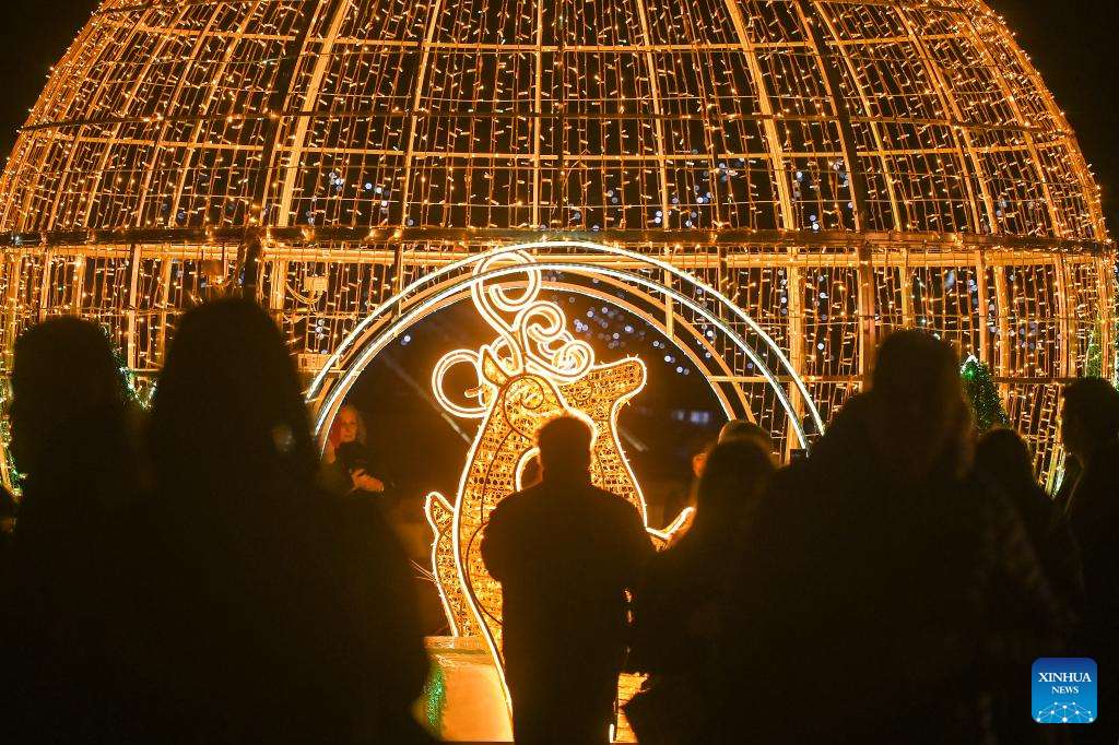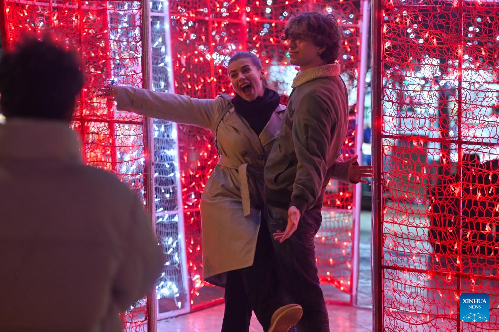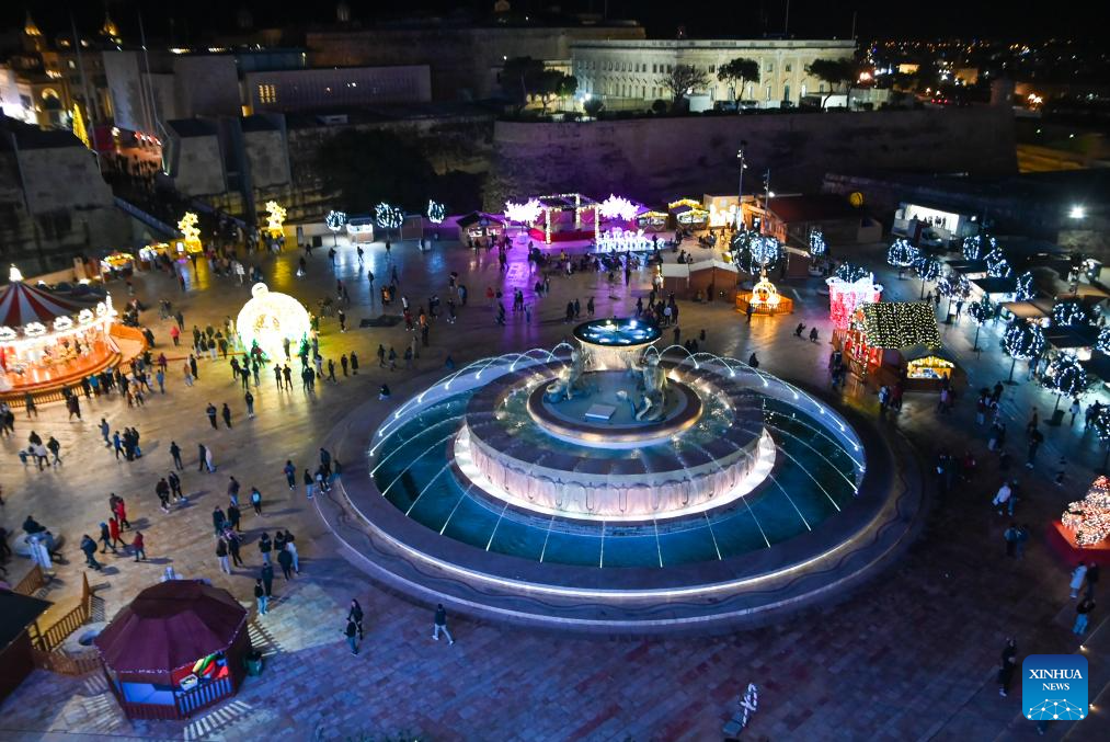 People visit a Christmas fairyland near the Triton Fountain in Valletta, Malta, Dec. 9, 2023. The fairyland decorated with Christmas lights was opened on Dec. 8, 2023 and will stay open until Jan. 7, 2024. (Photo by Jonathan Borg/Xinhua)