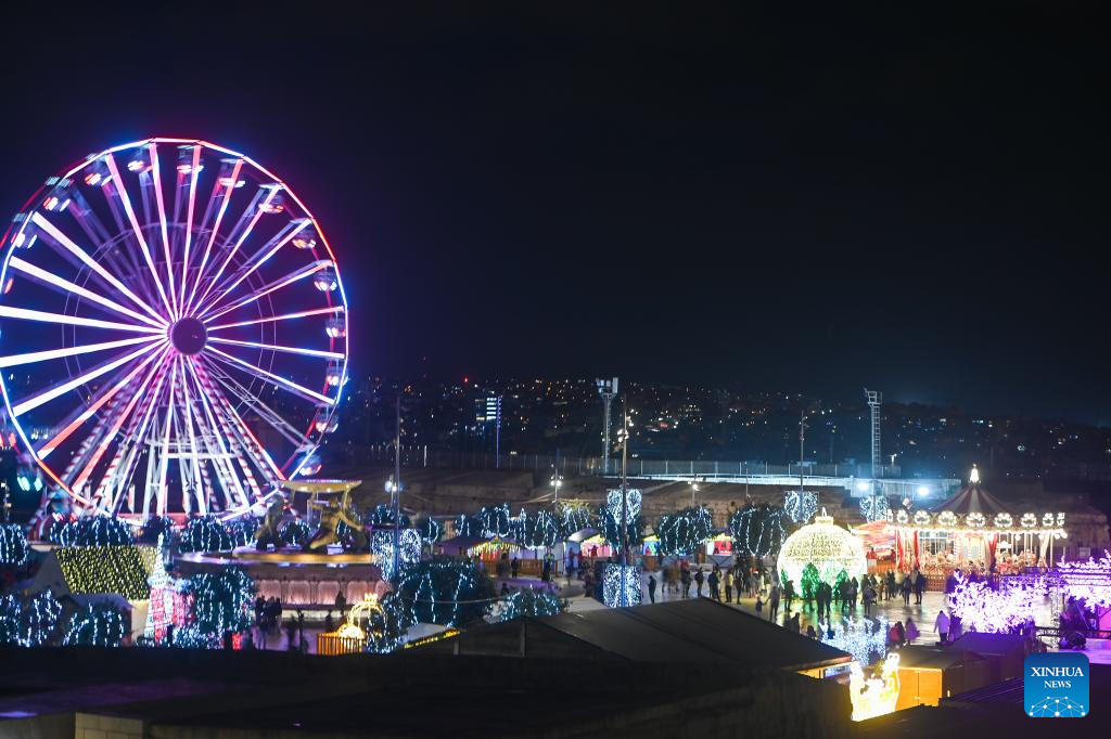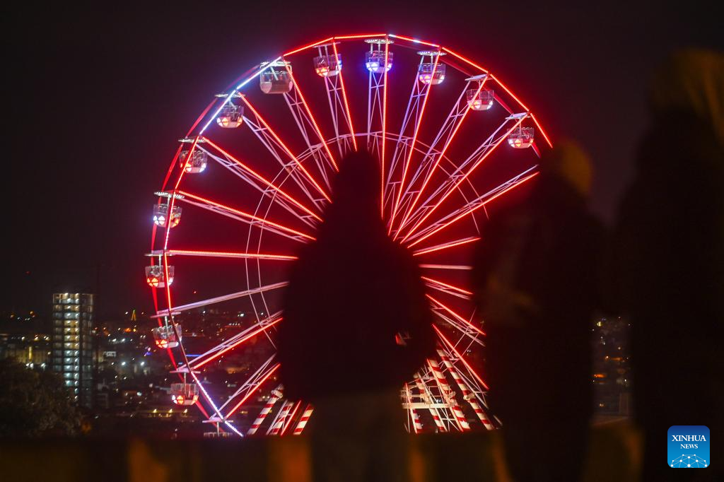 A Ferris wheel is seen at a Christmas fairyland near the Triton Fountain in Valletta, Malta, Dec. 9, 2023. The fairyland decorated with Christmas lights was opened on Dec. 8, 2023 and will stay open until Jan. 7, 2024. (Photo by Jonathan Borg/Xinhua)