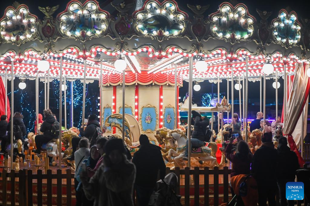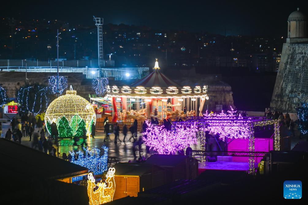 People enjoy a merry-go-round at a Christmas fairyland near the Triton Fountain in Valletta, Malta, Dec. 9, 2023. The fairyland decorated with Christmas lights was opened on Dec. 8, 2023 and will stay open until Jan. 7, 2024. (Photo by Jonathan Borg/Xinhua)