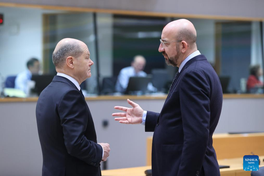 German Chancellor Olaf Scholz (L) speaks with European Council President Charles Michel during the European Council meeting in Brussels, Dec. 15, 2023. European Union (EU) leaders grappled with divisions on critical issues during a two-day European Council meeting, failing to reach a unanimous agreement on financial aid to Ukraine and the call for a humanitarian ceasefire in the Gaza Strip. (Xinhua/Zhao Dingzhe)