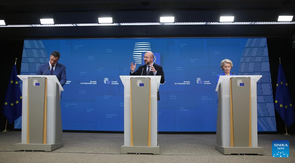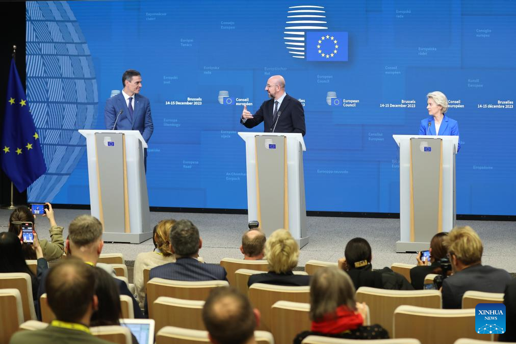 Spanish Prime Minister Pedro Sanchez, European Council President Charles Michel, and European Commission President Ursula von der Leyen (L to R) attend a press conference during the European Council meeting in Brussels, Dec. 15, 2023. European Union (EU) leaders grappled with divisions on critical issues during a two-day European Council meeting, failing to reach a unanimous agreement on financial aid to Ukraine and the call for a humanitarian ceasefire in the Gaza Strip. (Xinhua/Zhao Dingzhe)