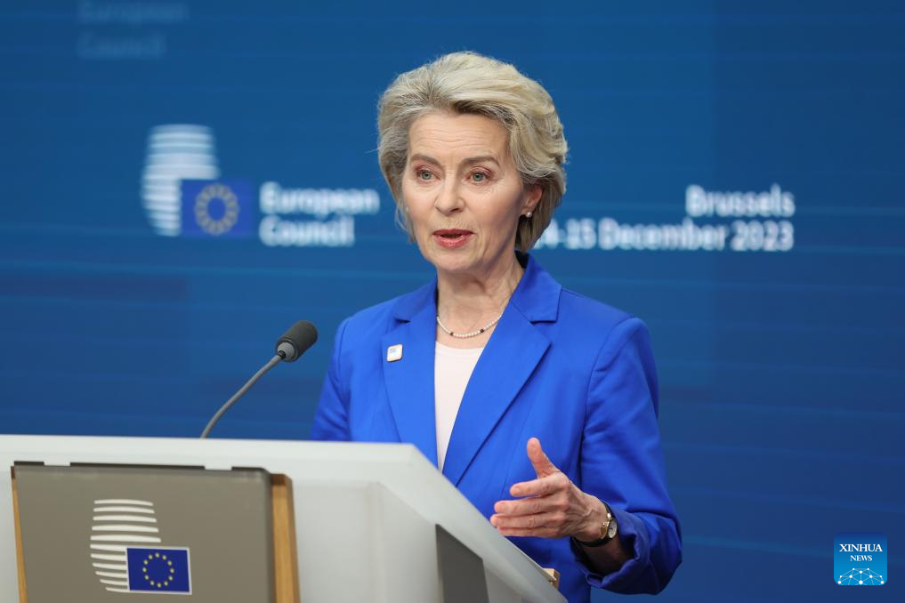 European Commission President Ursula von der Leyen speaks at a press conference during the European Council meeting in Brussels, Dec. 15, 2023. European Union (EU) leaders grappled with divisions on critical issues during a two-day European Council meeting, failing to reach a unanimous agreement on financial aid to Ukraine and the call for a humanitarian ceasefire in the Gaza Strip. (Xinhua/Zhao Dingzhe)
