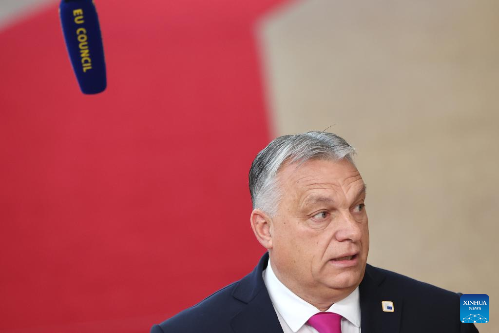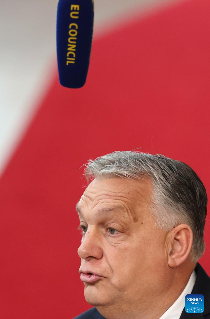 Hungarian Prime Minister Viktor Orban speaks to the press as he attends the European Council meeting in Brussels, Dec. 14, 2023. European Union (EU) leaders grappled with divisions on critical issues during a two-day European Council meeting, failing to reach a unanimous agreement on financial aid to Ukraine and the call for a humanitarian ceasefire in the Gaza Strip. (Xinhua/Zhao Dingzhe)
