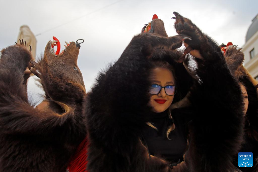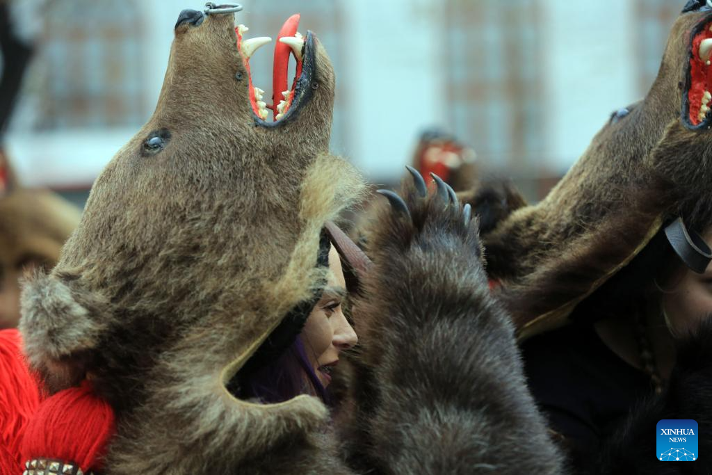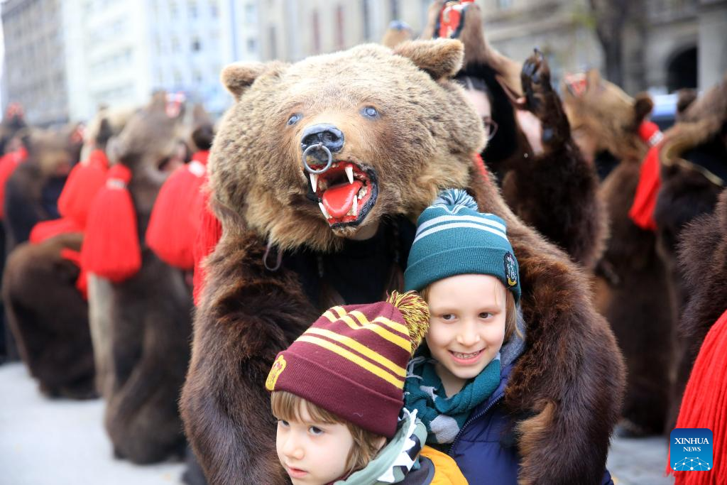 Members of a traditional song and dance band perform bear dance during the "Cetatea lui Bucur" festival of winter traditions and customs in Bucharest, Romania, on Dec. 16, 2023. (Photos by Cristian Cristel/Xinhua)