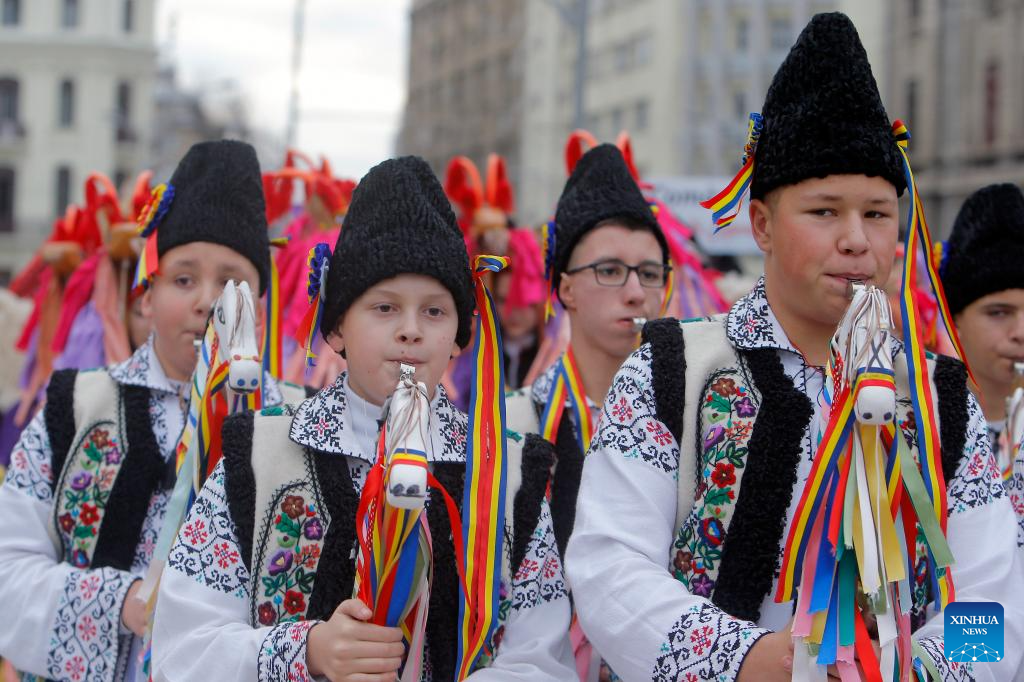 Members of a traditional song and dance band perform during the "Cetatea lui Bucur" festival of winter traditions and customs in Bucharest, Romania, on Dec. 16, 2023. (Photos by Cristian Cristel/Xinhua)