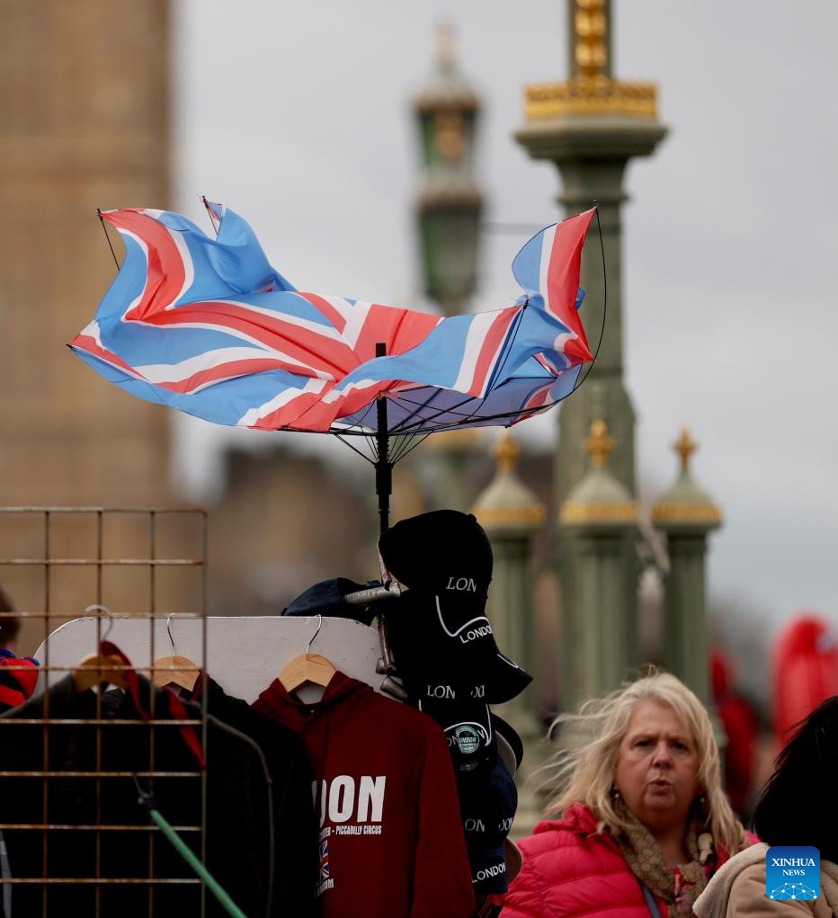 An umbrella is turned inside out by wind on Westminster Bridge in London, Britain, Dec. 21, 2023, as Storm Pia brings high winds to many parts of the UK and causes transport disruption across the country. (Xinhua/Li Ying)