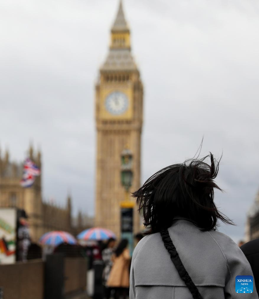 A woman walks on Westminster Bridge in London, Britain, Dec. 21, 2023, as Storm Pia brings high winds to many parts of the UK and causes transport disruption across the country. (Xinhua/Li Ying)