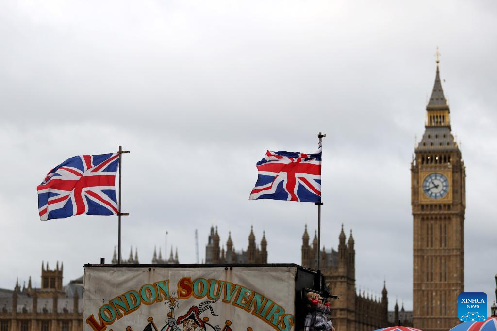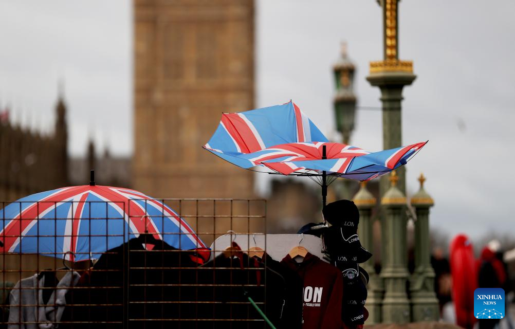 Union Jack flags fly in wind near the Big Ben in London, Britain, Dec. 21, 2023, as Storm Pia brings high winds to many parts of the UK and causes transport disruption across the country. (Xinhua/Li Ying)