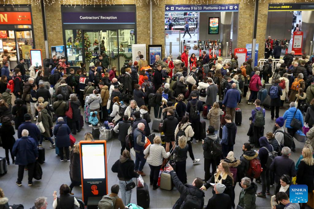 Passengers are stranded at King's Cross railway station in London, Britain, Dec. 21, 2023, as Storm Pia brings high winds to many parts of the UK and causes transport disruption across the country. (Xinhua)