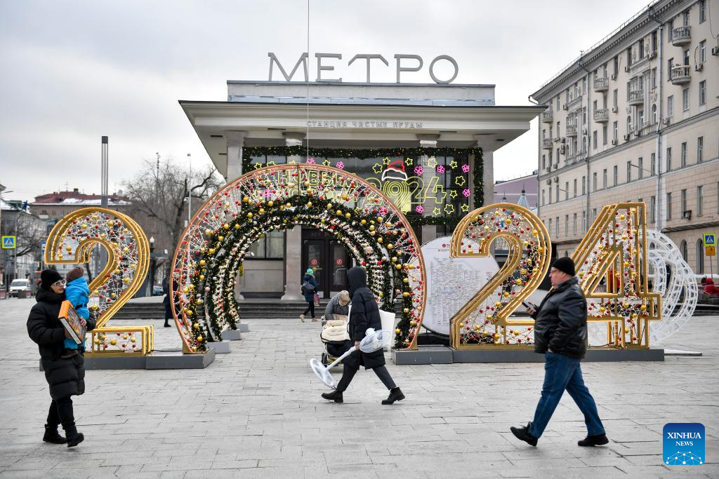 People walk past New Year decorations in central Moscow, Russia, Dec. 22, 2023. (Photo by Alexander Zemlianichenko Jr/Xinhua)