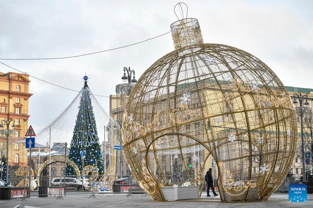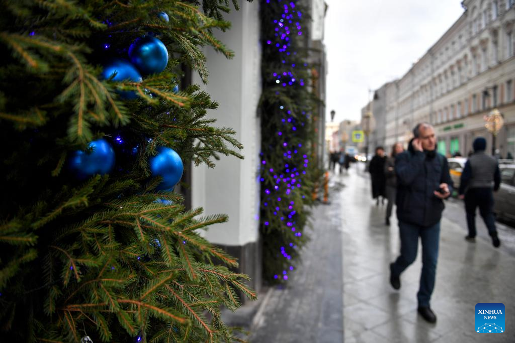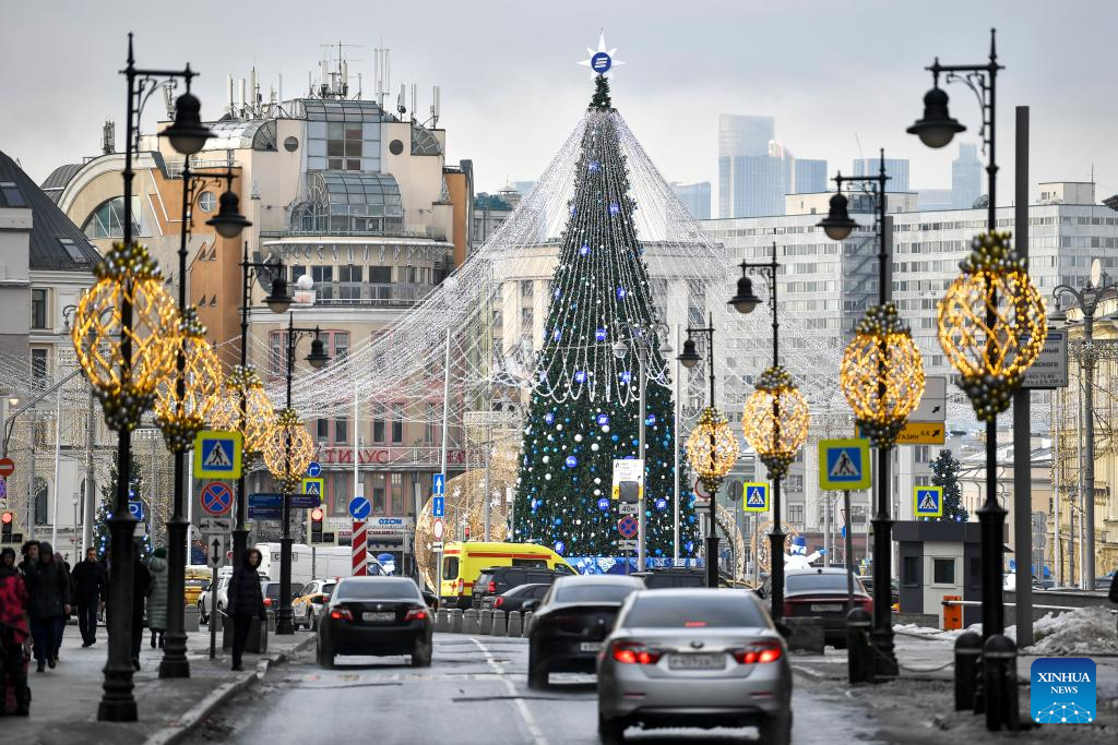 New Year decorations are seen in central Moscow, Russia, Dec. 22, 2023. (Photo by Alexander Zemlianichenko Jr/Xinhua)