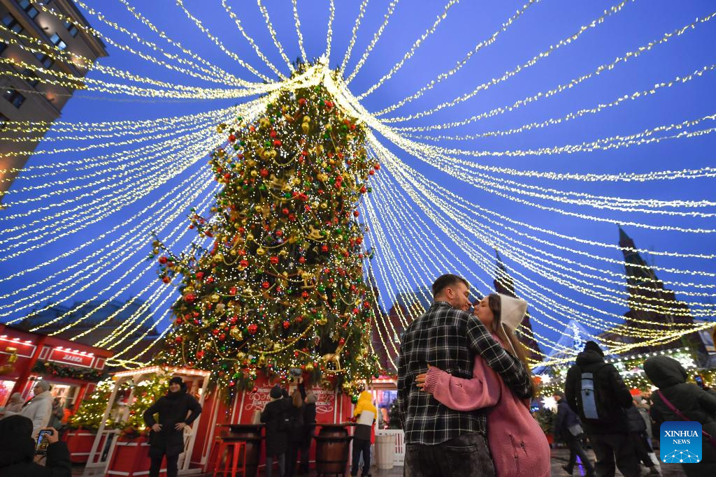 A couple kisses in front of a Christmas tree on Manezhnaya Square in Moscow, Russia, Dec. 21, 2023. (Photo by Alexander Zemlianichenko Jr/Xinhua)