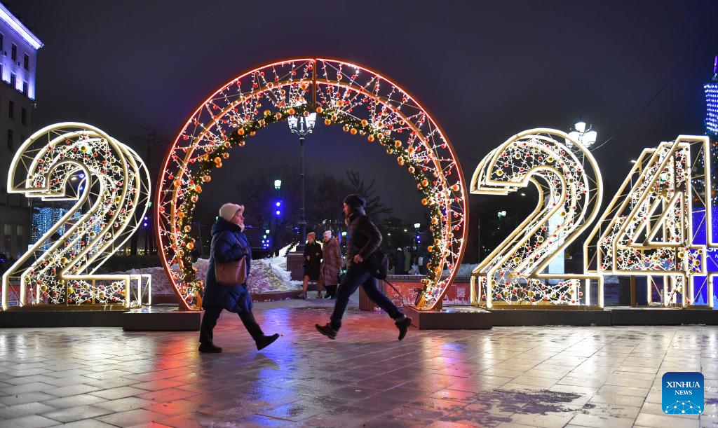 People walk past New Year decorations in central Moscow, Russia, Dec. 21, 2023. (Photo by Alexander Zemlianichenko Jr/Xinhua)