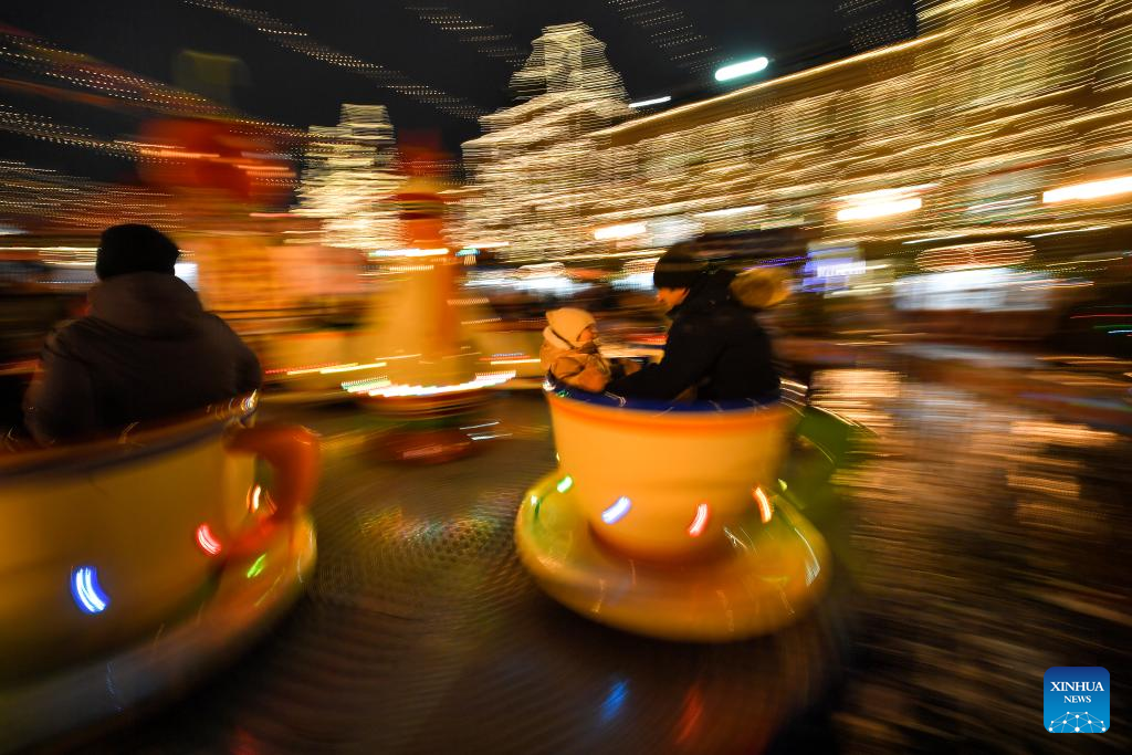People ride on a carousel at a fair on Red Square in Moscow, Russia, Dec. 21, 2023. (Photo by Alexander Zemlianichenko Jr/Xinhua)