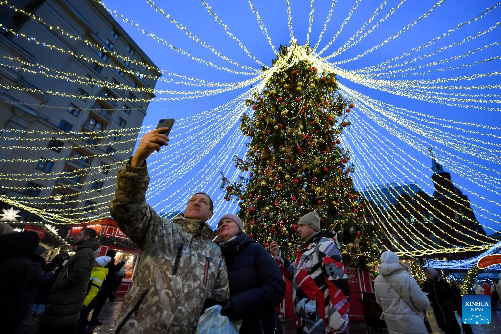 People take a selfie on Manezhnaya Square in Moscow, Russia, Dec. 21, 2023. (Photo by Alexander Zemlianichenko Jr/Xinhua)