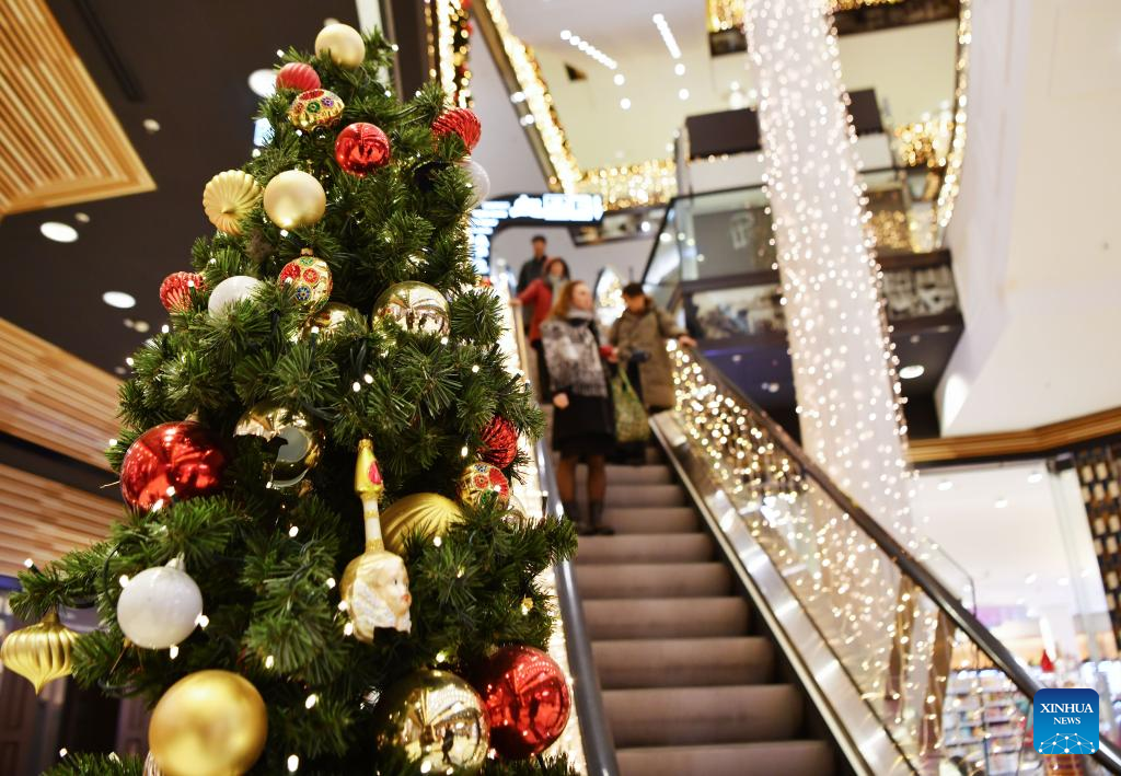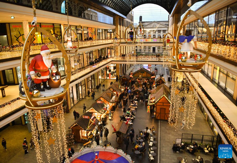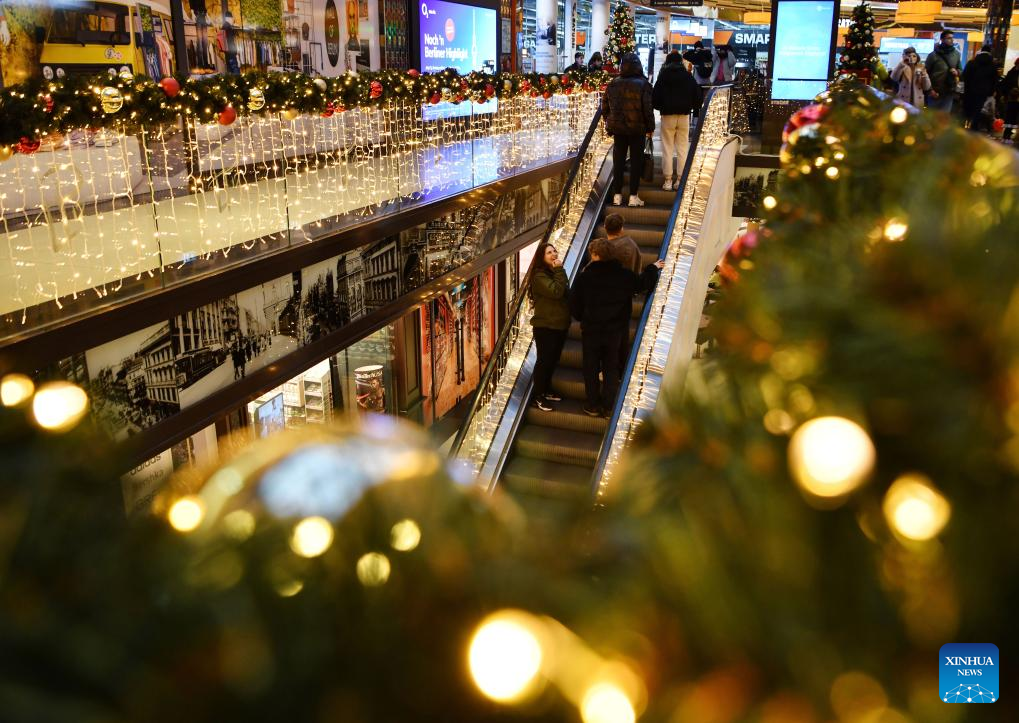 People shop at a shopping mall with Christmas decorations in Berlin, Germany, Dec. 21, 2023. (Xinhua/Ren Pengfei)