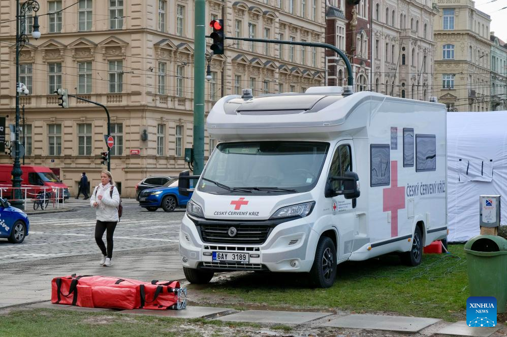 A vehicle of the Czech Red Cross is seen near the building of the Faculty of Arts of Charles University in Prague, the Czech Republic, Dec. 22, 2023. Czech Prime Minister Petr Fiala announced on Thursday that the government has designated Dec. 23 as a national day of mourning following a tragic incident at a Prague university where a 24-year-old student shot and killed 14 people, leaving 25 others wounded before possibly killing himself, according to local police. (Xinhua/Deng Yaomin)