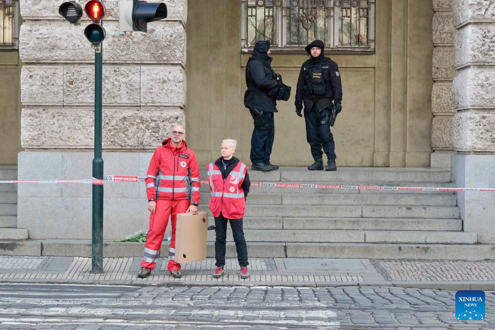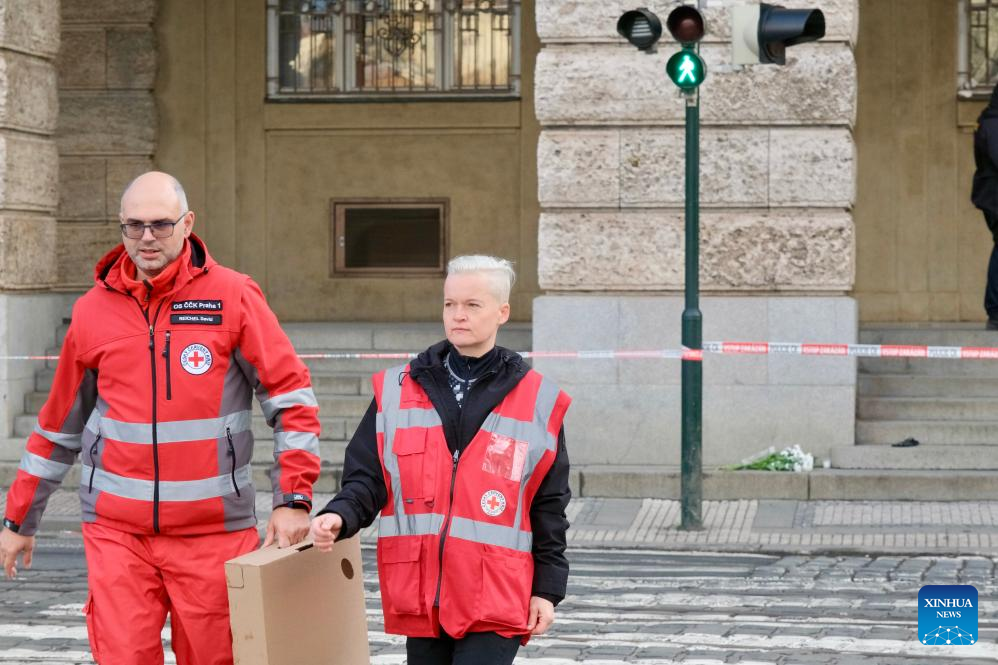 Czech Red Cross staff work near the building of the Faculty of Arts of Charles University in Prague, the Czech Republic, Dec. 22, 2023. Czech Prime Minister Petr Fiala announced on Thursday that the government has designated Dec. 23 as a national day of mourning following a tragic incident at a Prague university where a 24-year-old student shot and killed 14 people, leaving 25 others wounded before possibly killing himself, according to local police. (Xinhua/Deng Yaomin)