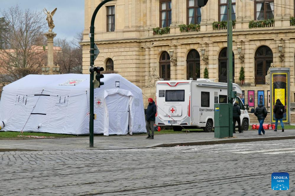 This photo taken on Dec. 22, 2023 shows a working site of the Czech Red Cross near the building of the Faculty of Arts of Charles University in Prague, the Czech Republic. Czech Prime Minister Petr Fiala announced on Thursday that the government has designated Dec. 23 as a national day of mourning following a tragic incident at a Prague university where a 24-year-old student shot and killed 14 people, leaving 25 others wounded before possibly killing himself, according to local police. (Xinhua/Deng Yaomin)