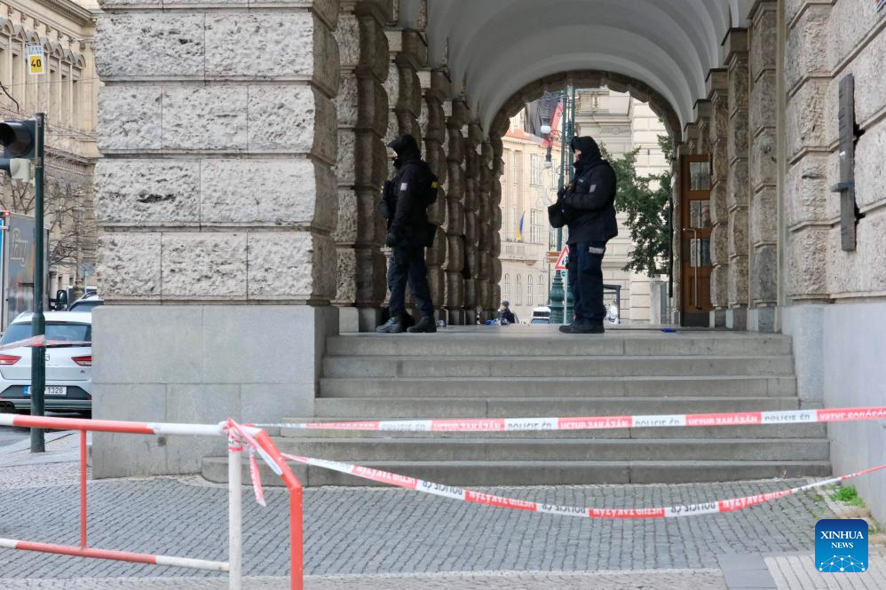 Police officers are seen at the building of the Faculty of Arts of Charles University in Prague, the Czech Republic, Dec. 22, 2023. Czech Prime Minister Petr Fiala announced on Thursday that the government has designated Dec. 23 as a national day of mourning following a tragic incident at a Prague university where a 24-year-old student shot and killed 14 people, leaving 25 others wounded before possibly killing himself, according to local police. (Xinhua/Deng Yaomin)
