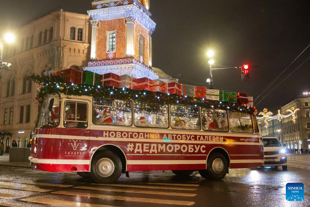 A bus with festive decorations carrying people dressed as Father Frost runs on the road in St. Petersburg, Russia, Dec. 23, 2023. (Photo by Irina Motina/Xinhua)