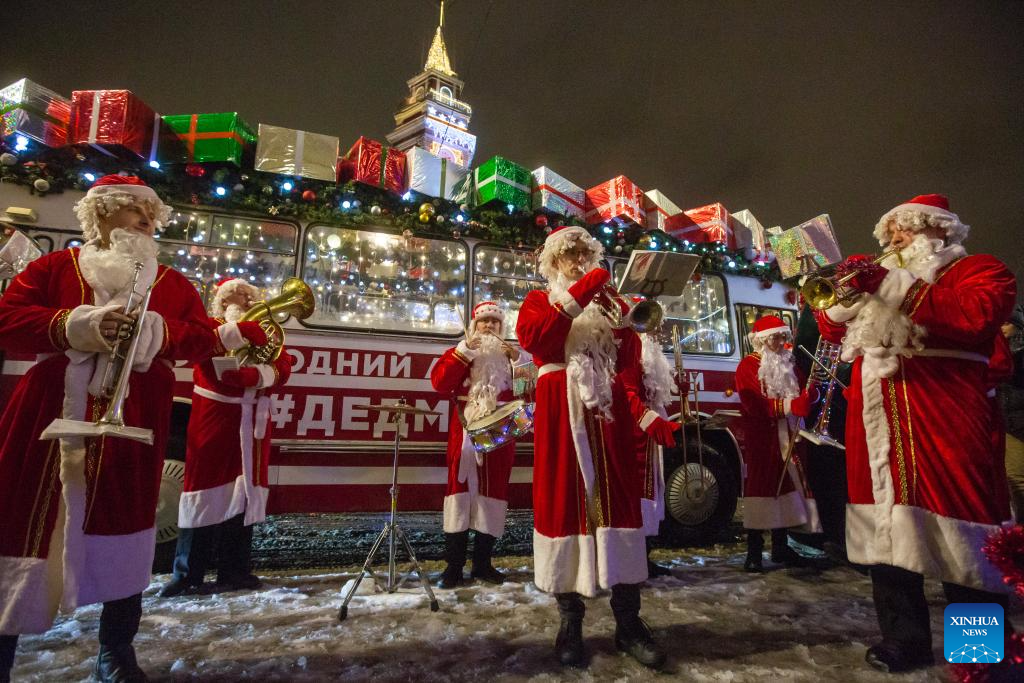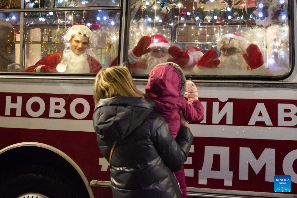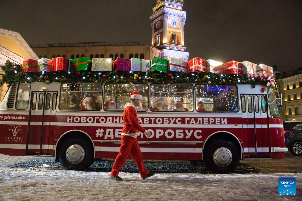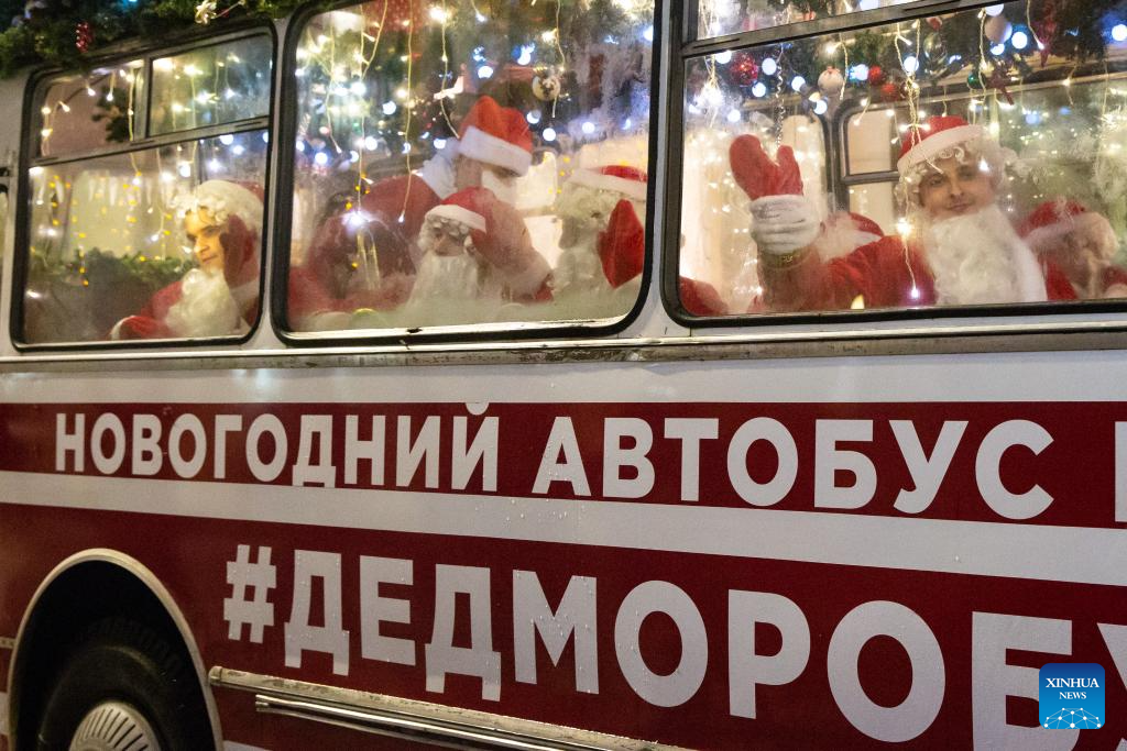 People dressed as Father Frost greet citizens from a bus with festive decorations in St. Petersburg, Russia, Dec. 23, 2023. (Photo by Irina Motina/Xinhua)