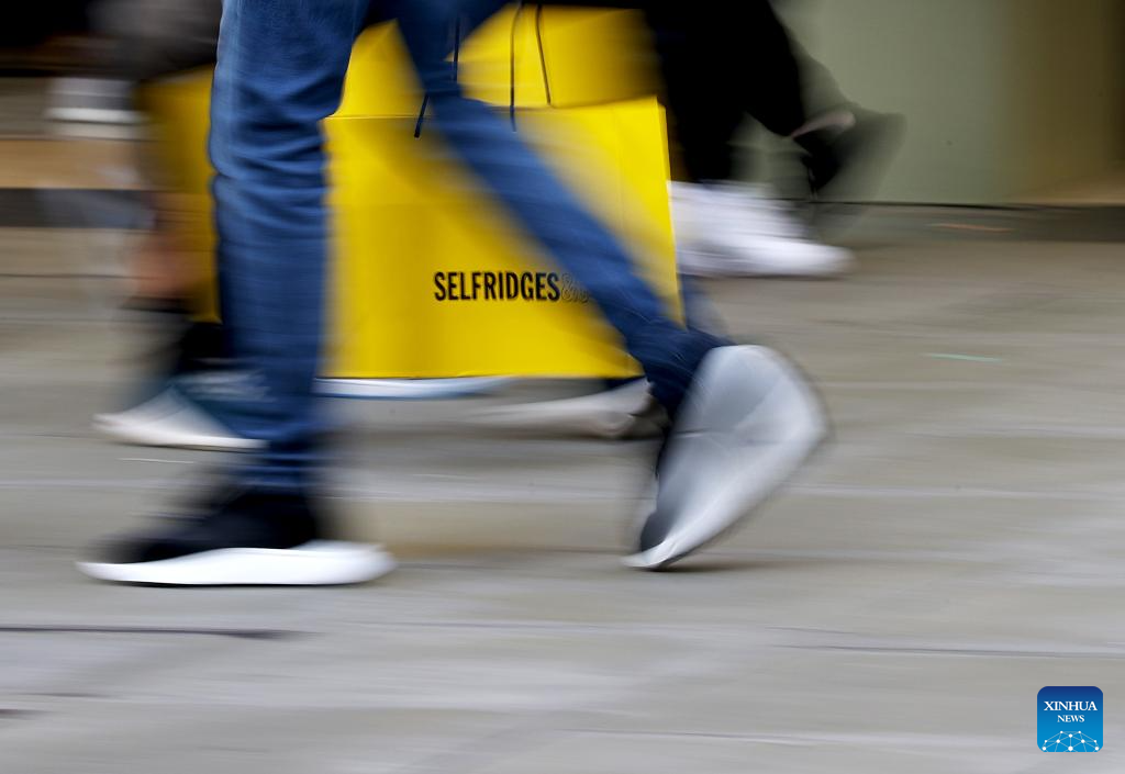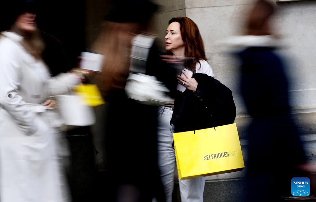 People walk with their shopping bags during Boxing Day sales in London, Britain, on Dec. 26, 2023. (Xinhua/Li Ying)