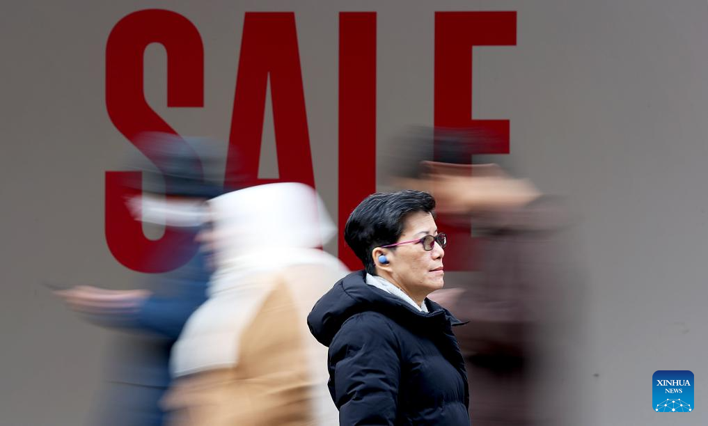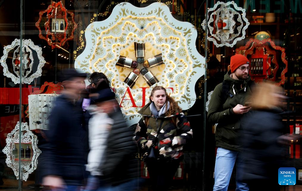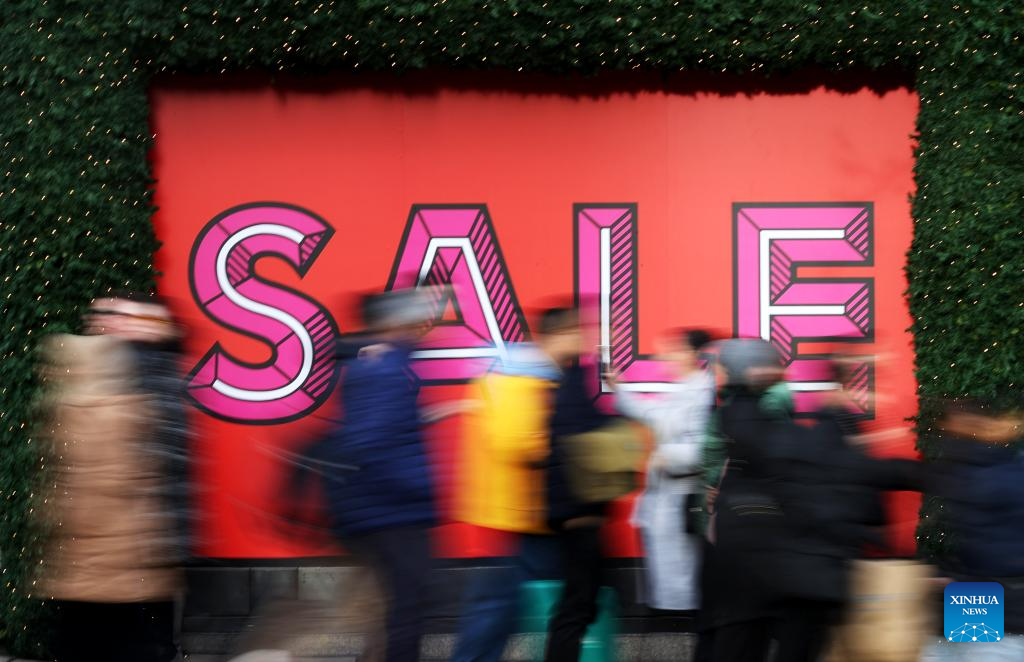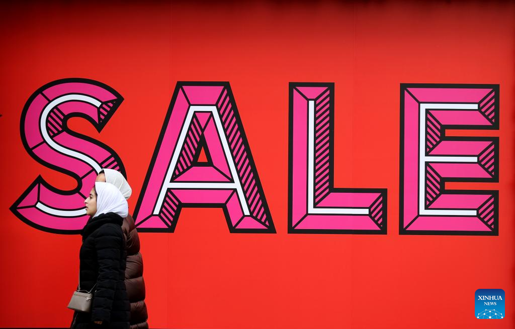 People walk past a sale sign outside a store during Boxing Day sales in London, Britain, on Dec. 26, 2023. (Xinhua/Li Ying)