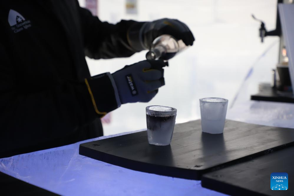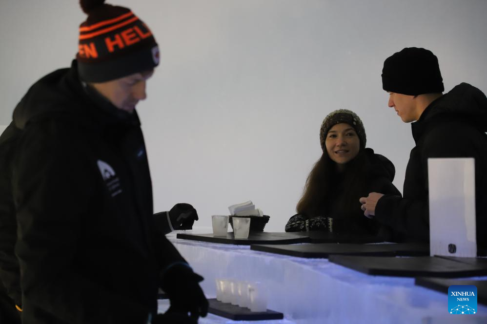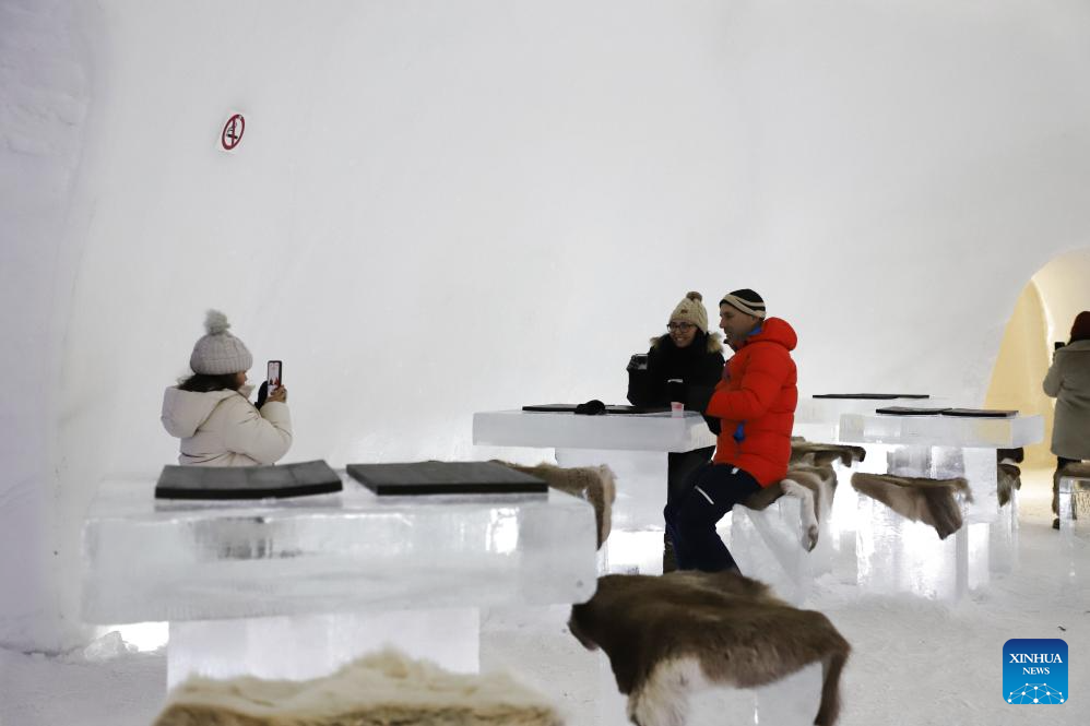 Visitors have cold drinks at a bar in an ice hotel in Sinetta, Finland, Dec. 28, 2023. An ice hotel with ice church, ice restaurant, ice bar and other facilities opened in Sinetta, attracting many tourists. (Xinhua/Chen Jing)