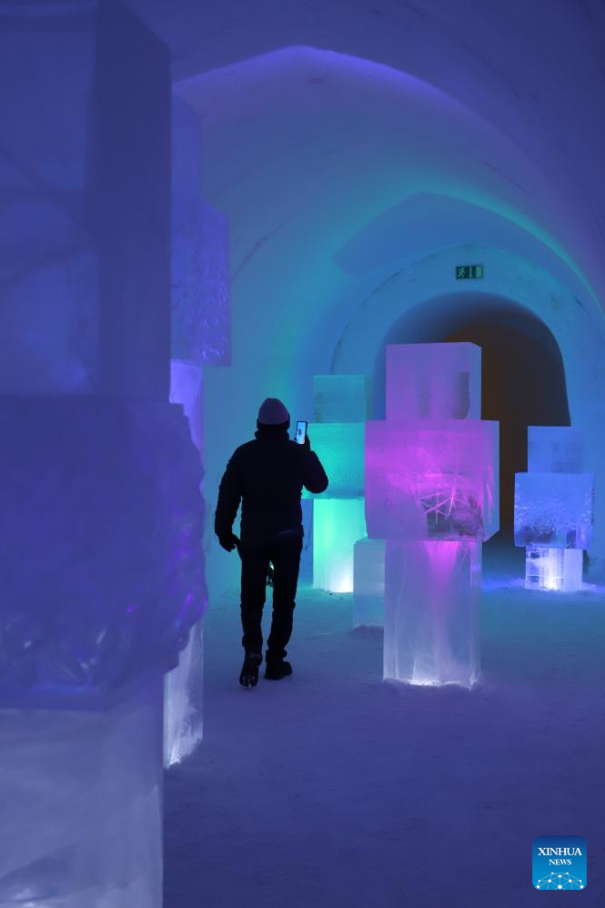 A tourist visits an ice hotel in Sinetta, Finland, Dec. 28, 2023. An ice hotel with ice church, ice restaurant, ice bar and other facilities opened in Sinetta, attracting many tourists. (Xinhua/Chen Jing)