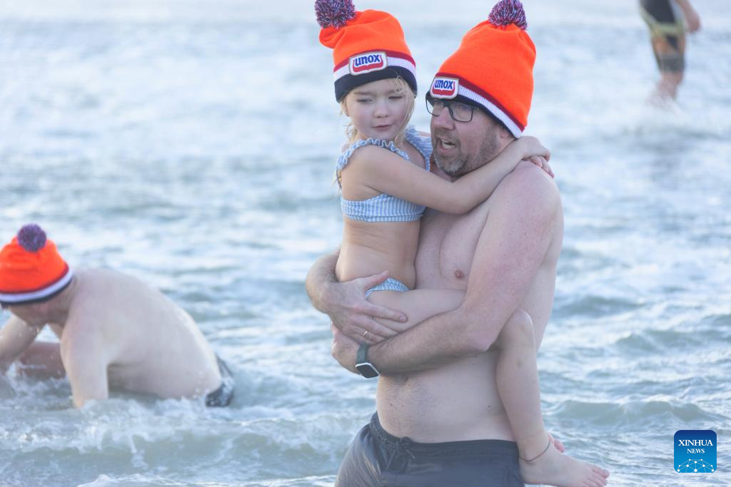 BLOEMENDAAL, the Netherlands, Jan. 1 (Xinhua) -- Hundreds of Dutch people dashed into the icy North Sea in the coastal city of Bloemendaal on Monday morning to celebrate the New Year.