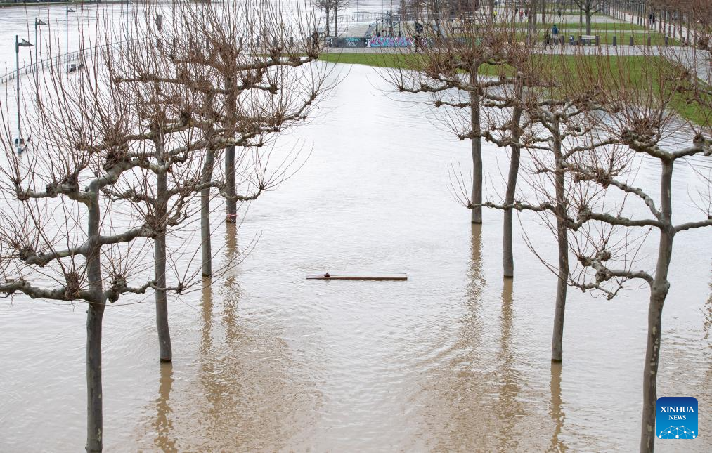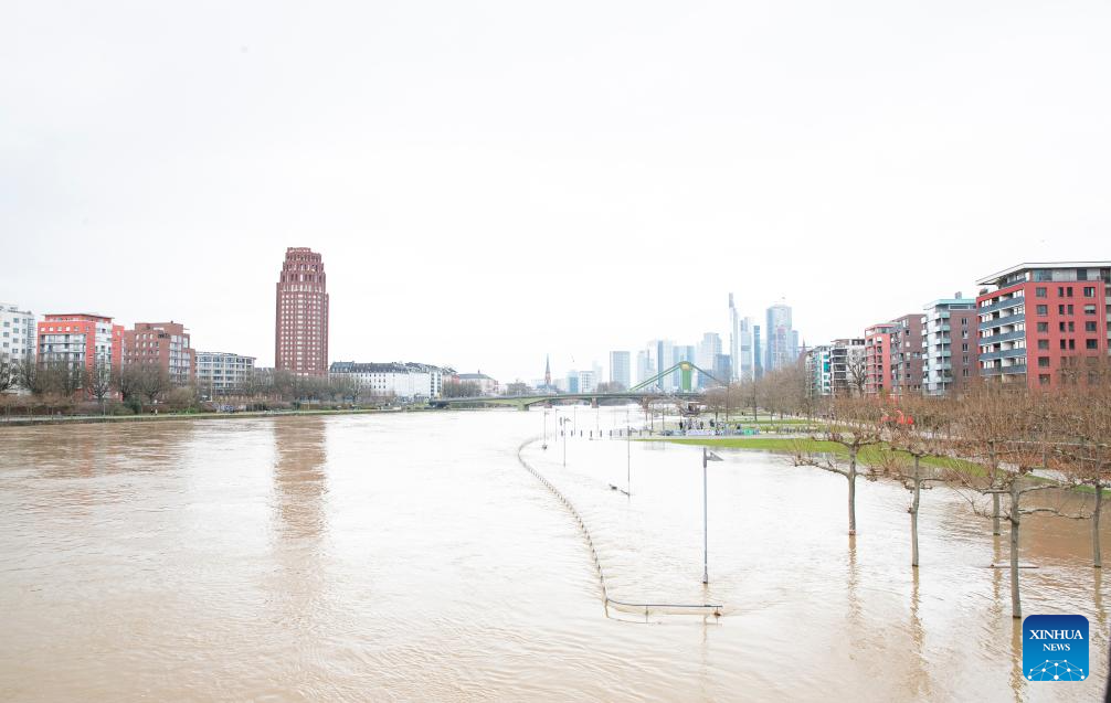 The river bank of Main River is submerged in flood water in Frankfurt, Germany, Jan. 7, 2024. Some areas in Frankfurt were flooded due to continuous rainfall and rising water level of the Main River. (Xinhua/Zhang Fan)